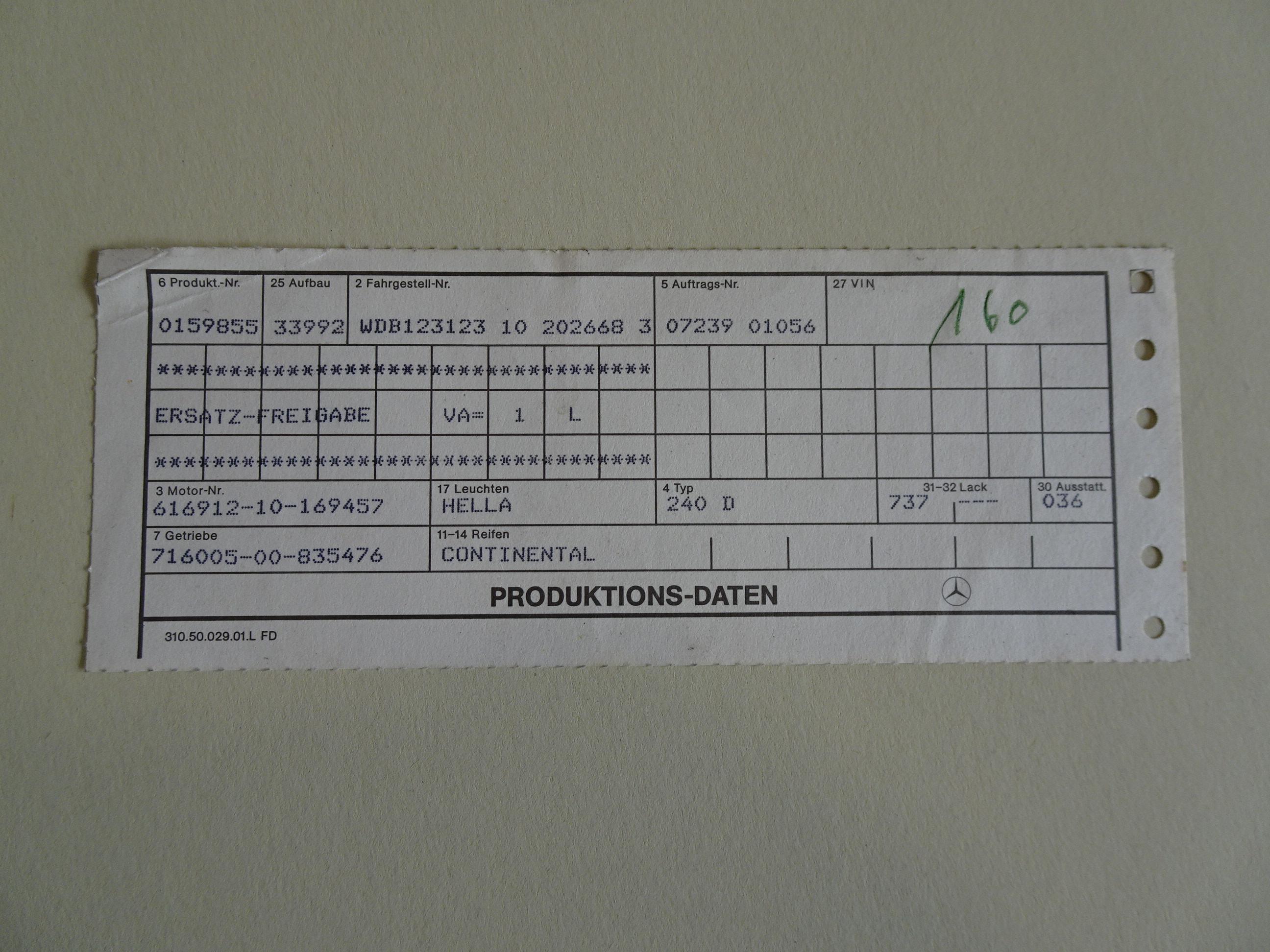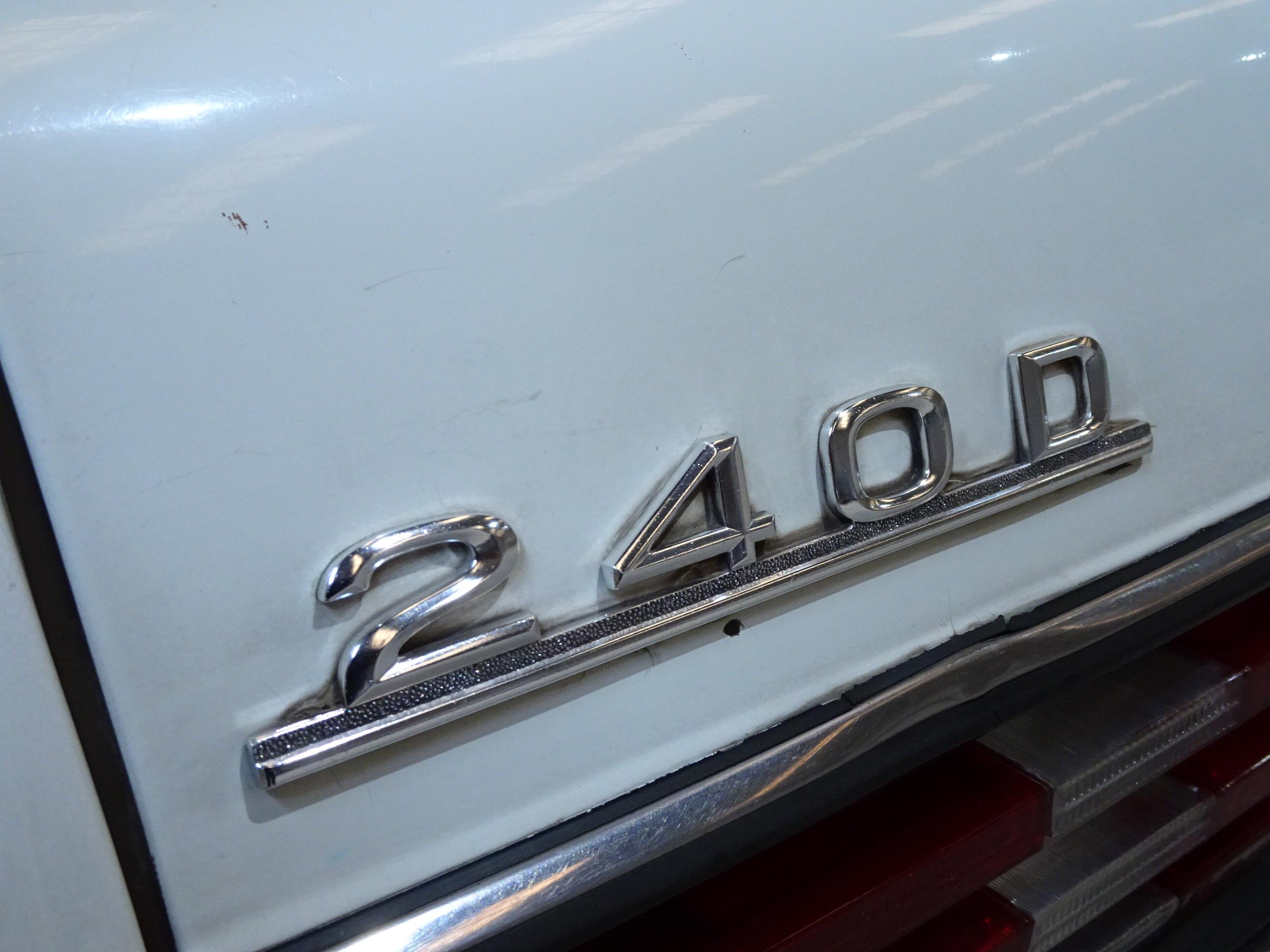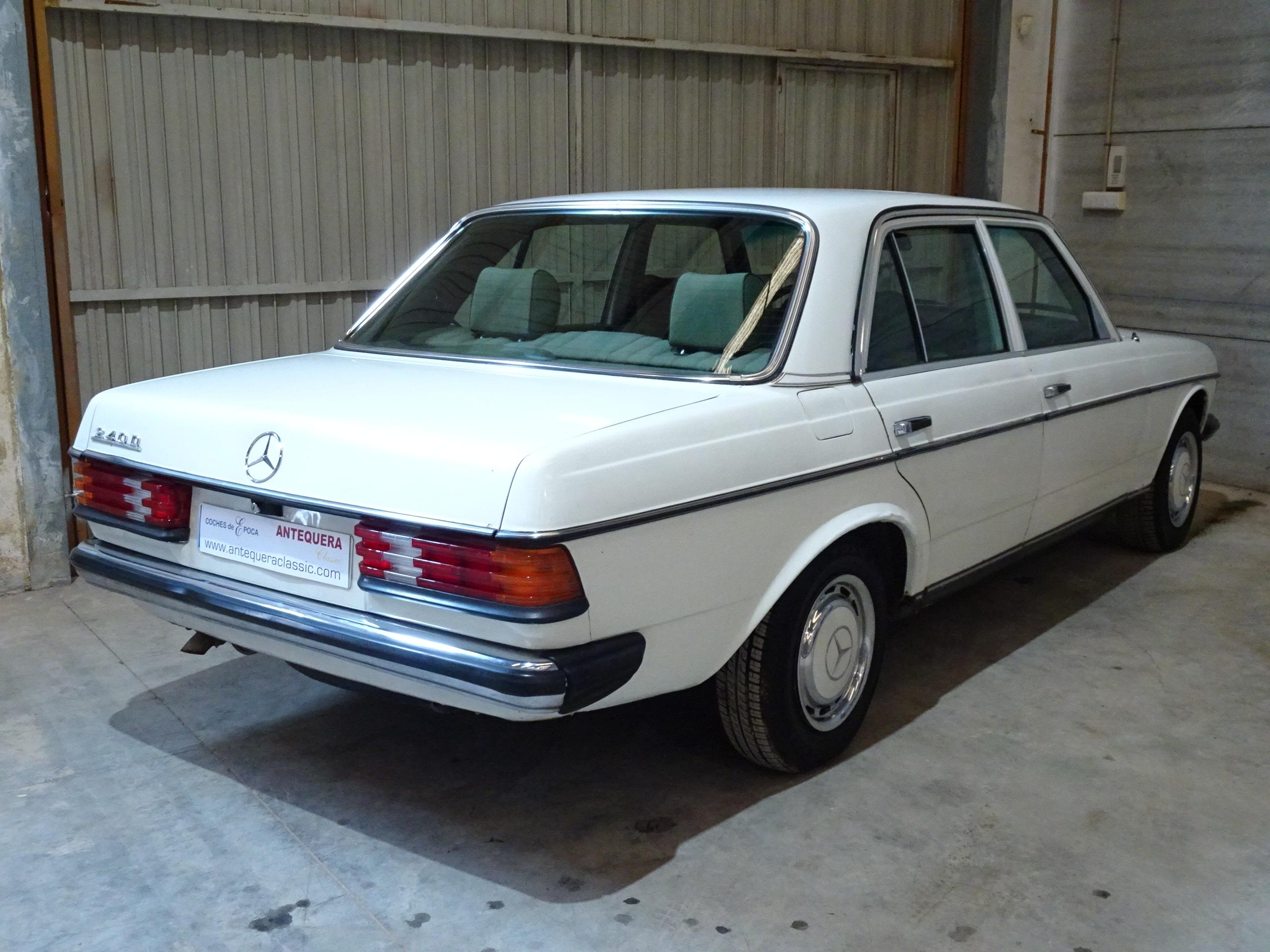 2.399 CC., 72 CV, 4 CILINDROS, CAMBIO MANUAL 4 VELOCIDADES, MERCEDES-BENZ CLASE E TYP 123D, W123 VERSIÓN 240D 123.123, MOTOR DIESEL 616.912, MATCHING NUMBERS, BOMBA INYECCIÓN DIESEL BOSCH, PINTURA BLANCA CLASSIC WHITE 737U, TAPICERÍA MB-TEX Y TELA VERDE 036, DIRECCIÓN ASISTIDA, FRENOS DE DISCO, CIERRE CENTRALIZADO, TECHO SOLAR CORREDIZO MANUALMENTE, 5 PLAZAS, ASIENTO DEL CONDUCTOR CON REGULACIÓN EN ALTURA, RADIO-CASSETTE SANYO, PARABRISAS CON FRANJA TINTADA, LUNETA TRASERA TÉRMICA, TOTALMENTE ORIGINAL, BUEN ESTADO DE CONSERVACIÓN, FUNCIONAMIENTO CORRECTO (PERÍODO DE INACTIVIDAD DESDE 2020), DEFECTOS A MEJORAR (PLANCHA-PINTURA), SOLO 2 PROPIETARIOS, MISMO PROPIETARIO LOS ÚLTIMOS 38 AÑOS, 167.000 KILÓMETROS ORIGINALES, LIBROS DE INSTRUCCIONES, MATRÍCULA PROVINCIAL (V), DOCUMENTACIÓN COMPLETA, POSIBILIDAD OBTENCIÓN VEHÍCULO HISTÓRICO (CON ITV CADA 4 AÑOS).