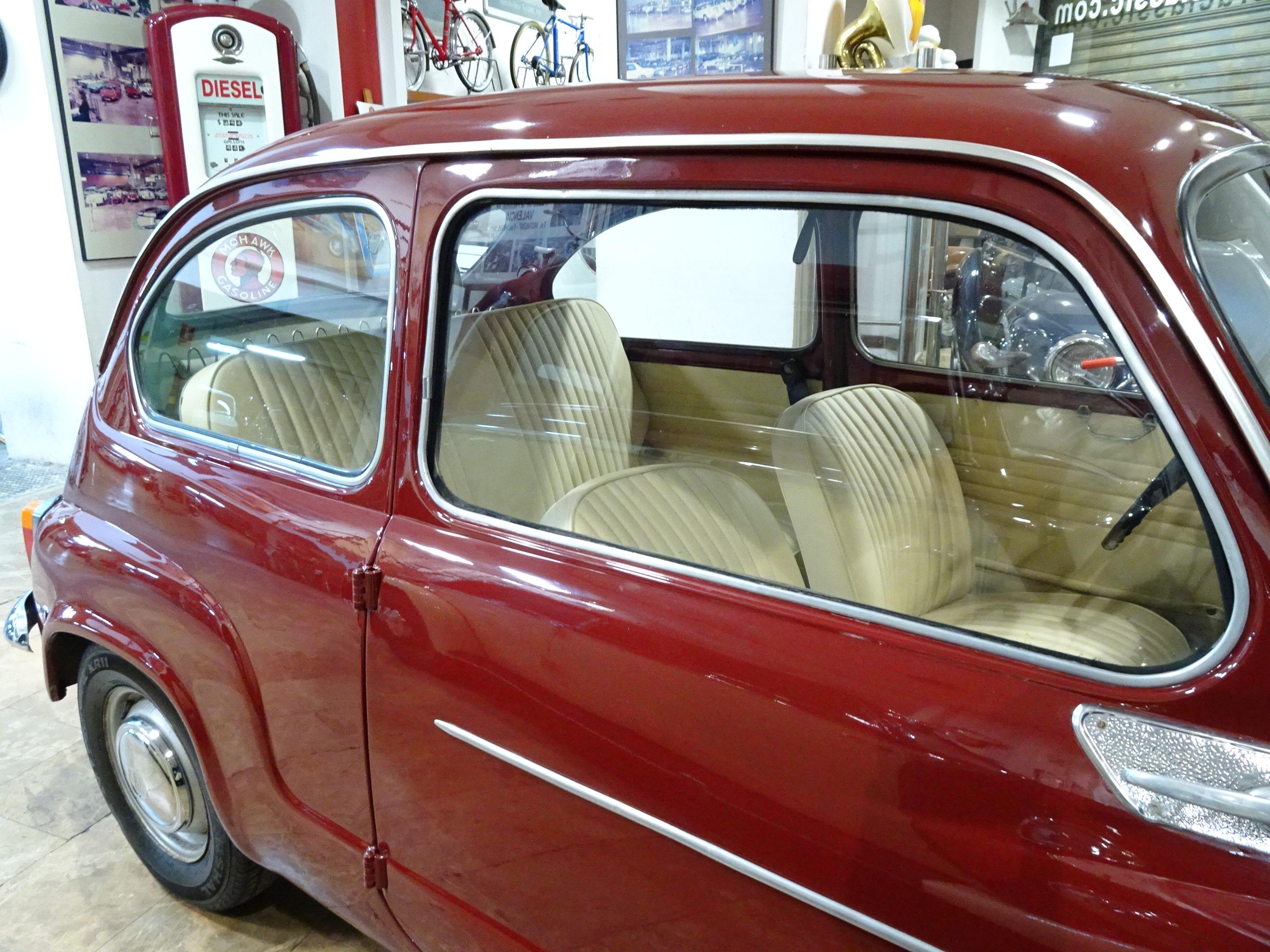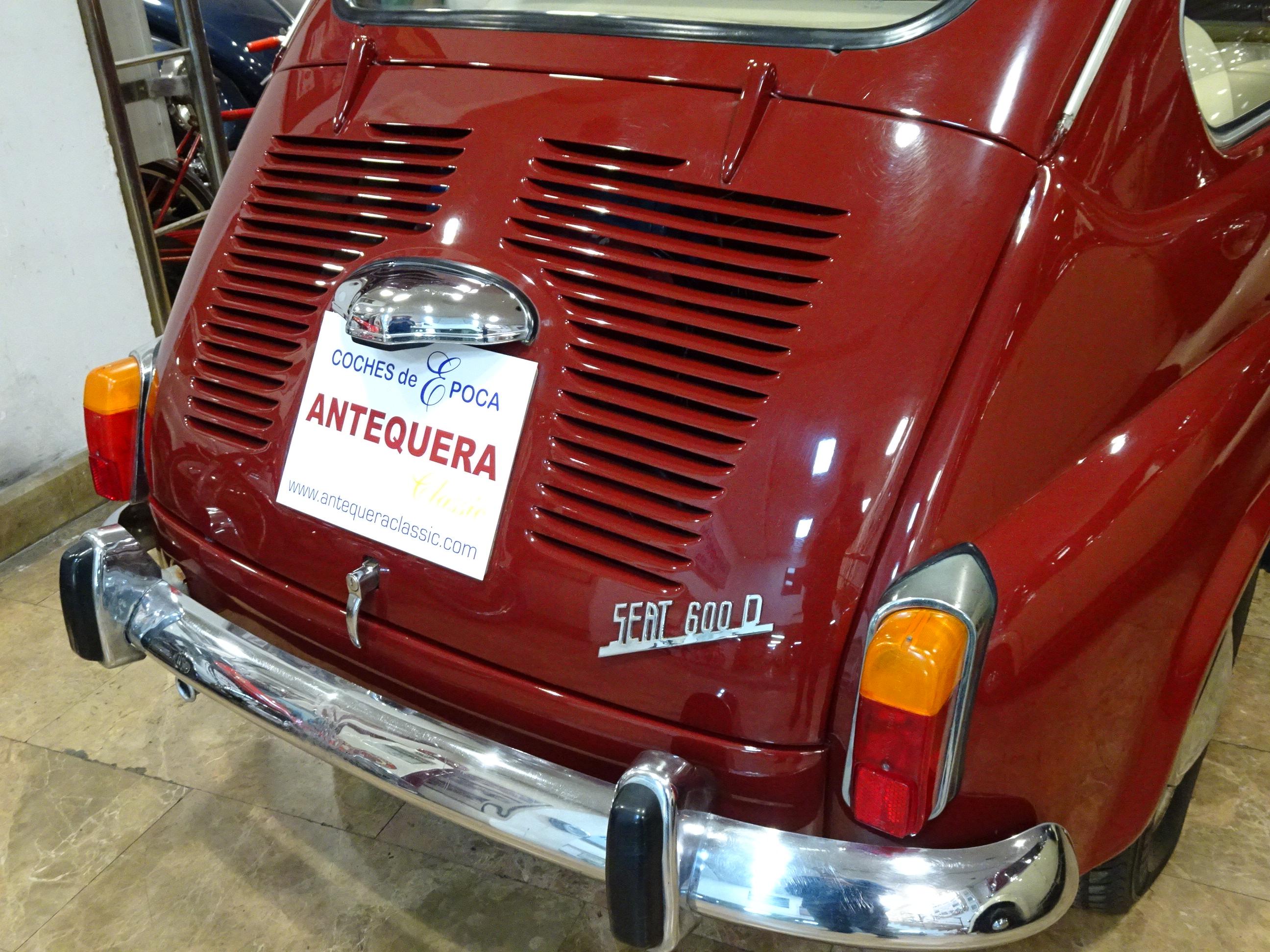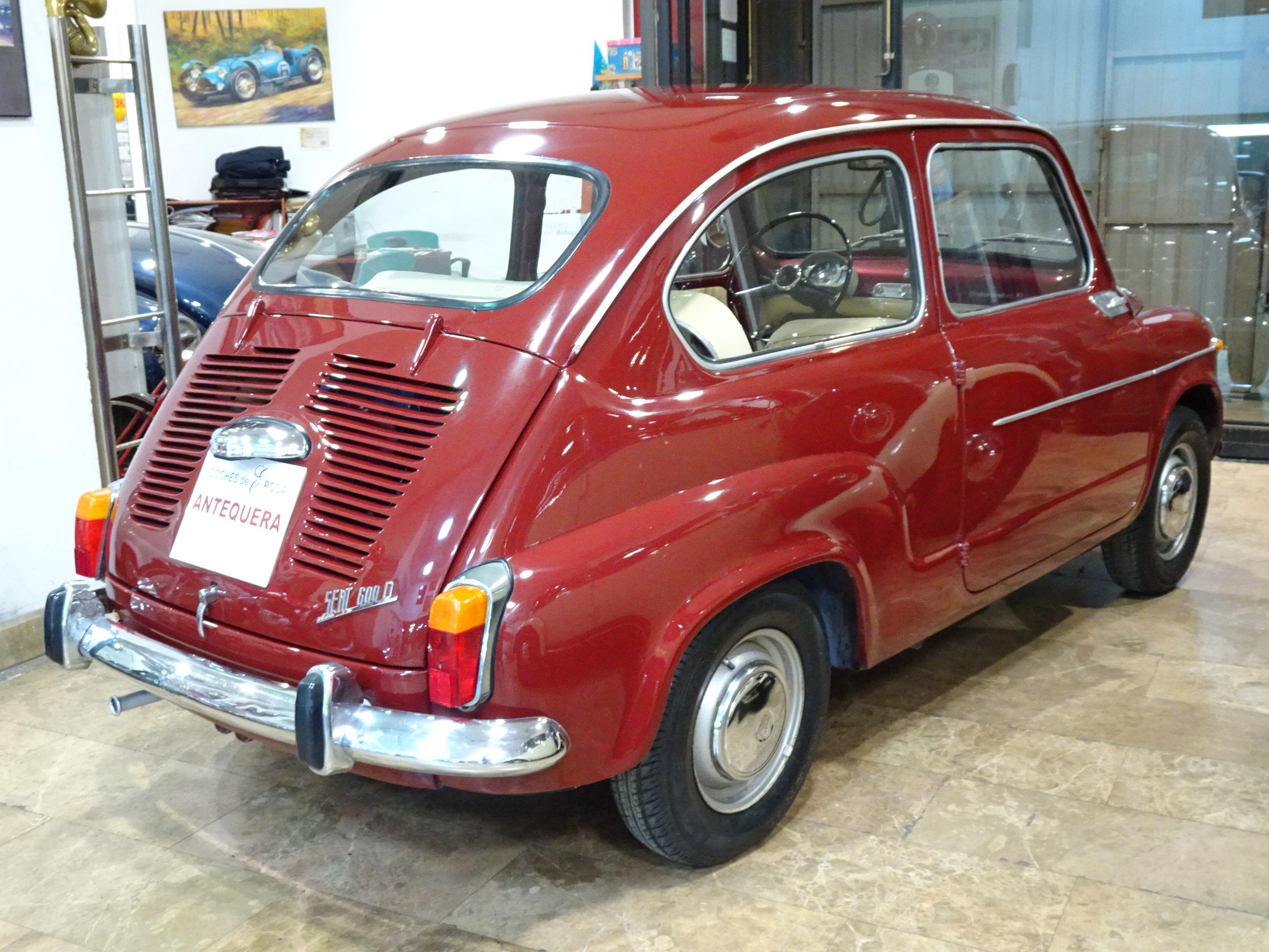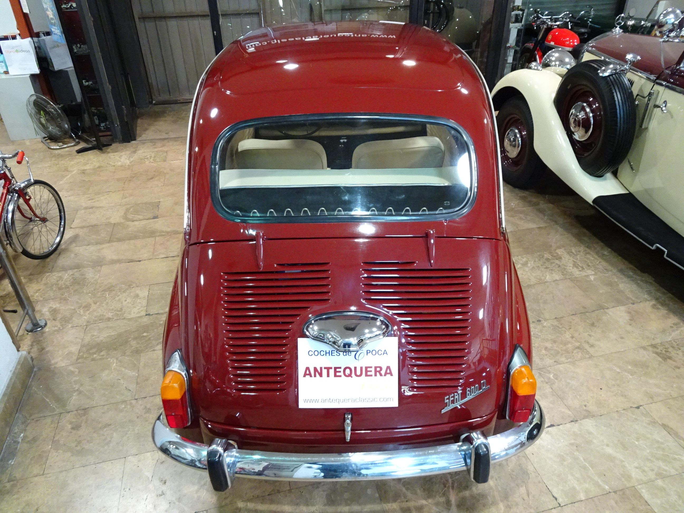 767 CC., 29 CV, 4 CILINDROS, 4 VELOCIDADES, VERSIÓN SEISCIENTOS D SEGUNDA SERIE, COLOR GRANATE - BURDEOS, BANDEJA CENTRAL Y TRASERA CROMADAS, CAJA HERRAMIENTAS ORIGINAL SEAT, RADIADOR MAYOR CAPACIDAD (DE MONTAÑA), 4 PLAZAS, ALUMBRADO VERSIÓN 600 E, LIBROS DE INSTRUCCIONES ORIGINALES, TAPICERÍA BEIGE, RECIÉN TAPIZADO (ASIENTOS Y PANELES LATERALES), PUESTA A PUNTO RECIENTE (BOMBA DE AGUA, FRENOS, CARBURACIÓN, ETC.), MISMO PROPIETARIO DESDE HACE MÁS DE 25 AÑOS, MUY ORIGINAL, MUY BUEN ESTADO, CORRECTO FUNCIONAMIENTO, MATRÍCULA ORIGINAL (V), DOCUMENTACIÓN e ITV AL DÍA.