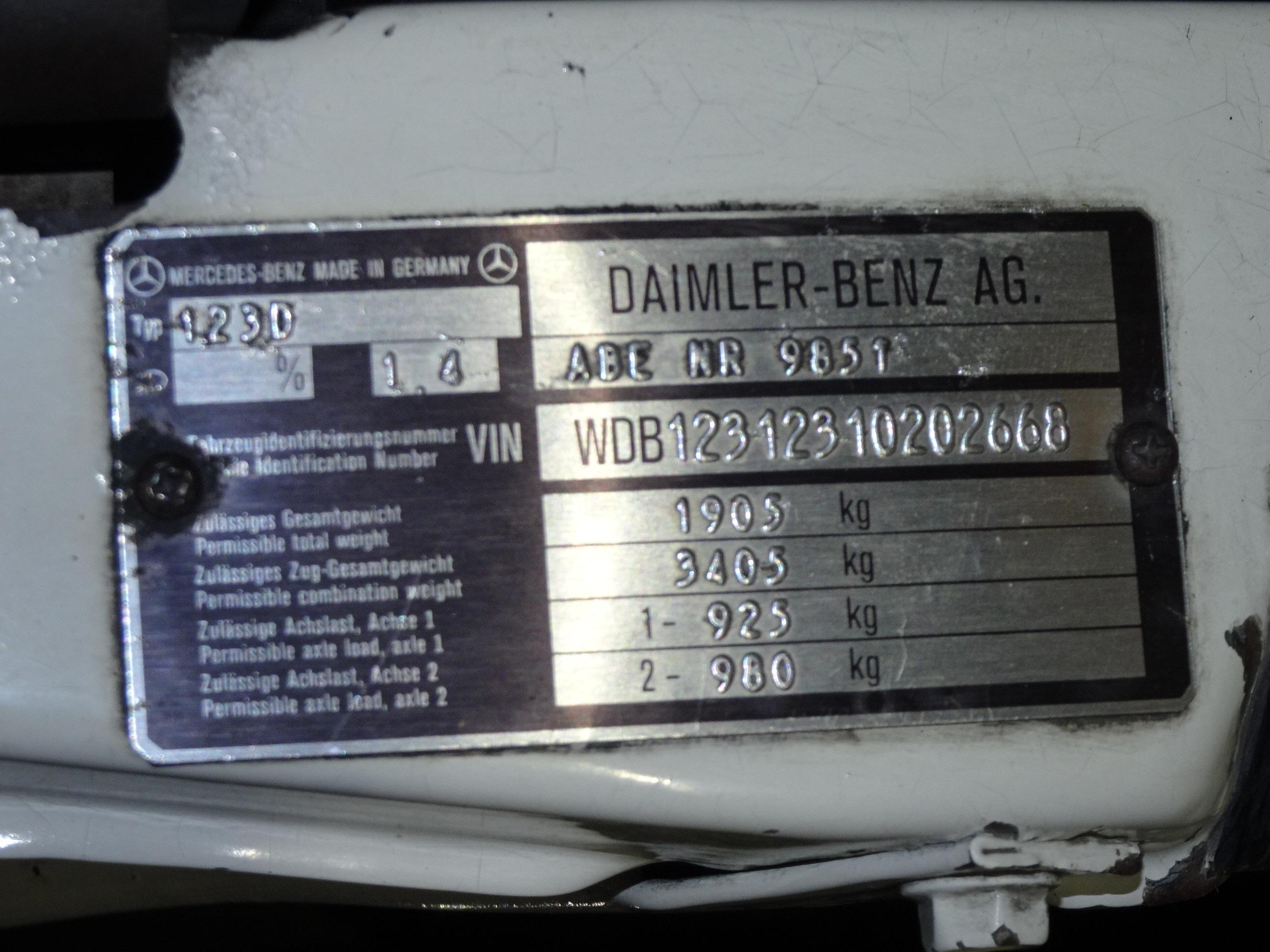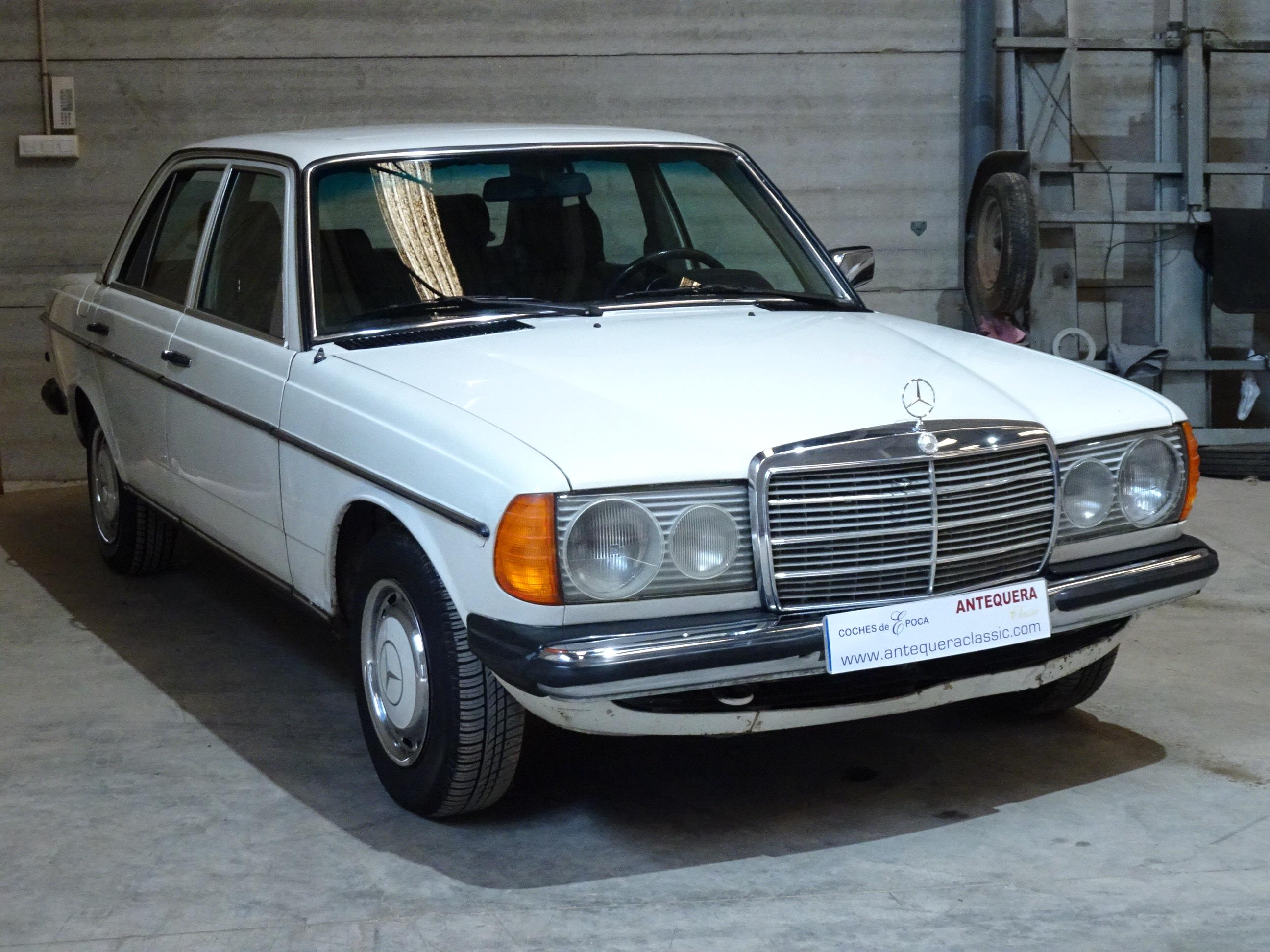 2.399 CC., 72 CV, 4 CILINDROS, CAMBIO MANUAL 4 VELOCIDADES, MERCEDES-BENZ CLASE E TYP 123D, W123 VERSIÓN 240D 123.123, MOTOR DIESEL 616.912, MATCHING NUMBERS, BOMBA INYECCIÓN DIESEL BOSCH, PINTURA BLANCA CLASSIC WHITE 737U, TAPICERÍA MB-TEX Y TELA VERDE 036, DIRECCIÓN ASISTIDA, FRENOS DE DISCO, CIERRE CENTRALIZADO, TECHO SOLAR CORREDIZO MANUALMENTE, 5 PLAZAS, ASIENTO DEL CONDUCTOR CON REGULACIÓN EN ALTURA, RADIO-CASSETTE SANYO, PARABRISAS CON FRANJA TINTADA, LUNETA TRASERA TÉRMICA, TOTALMENTE ORIGINAL, BUEN ESTADO DE CONSERVACIÓN, FUNCIONAMIENTO CORRECTO (PERÍODO DE INACTIVIDAD DESDE 2020), DEFECTOS A MEJORAR (PLANCHA-PINTURA), SOLO 2 PROPIETARIOS, MISMO PROPIETARIO LOS ÚLTIMOS 38 AÑOS, 167.000 KILÓMETROS ORIGINALES, LIBROS DE INSTRUCCIONES, MATRÍCULA PROVINCIAL (V), DOCUMENTACIÓN COMPLETA, POSIBILIDAD OBTENCIÓN VEHÍCULO HISTÓRICO (CON ITV CADA 4 AÑOS).